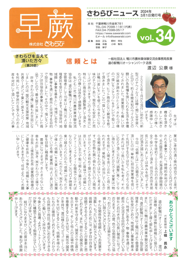 2024年3月1日発行号巻頭記事第26話 渡辺 公康 様「信頼とは」 2024 9/12 さわらびニュース 2024-09-12 さわらびニュース 2023年3月1日発行号巻頭記事第25話 星野 伸之 様「上條会長・上條社長の想い出」 2024年9月1日発行号巻頭記事第27話 武本 典久 様「繋がりと信念」 関連記事 2024年9月1日発行号巻頭記事第27話 武本 典久 様「繋がりと信念」 2024-09-12 2023年3月1日発行号巻頭記事第25話 星野 伸之 様「上條会長・上條社長の想い出」 2024-09-12 2022年4月1日発行号巻頭記事第24話 高橋 昭仁 様「感謝を心に、コロナ後を見据えて協力を!」 2024-09-12 2021年3月1日発行号巻頭記事第23話 廣瀬 勝彦 様「おもてなしの中にある厳しさ!」 2024-03-01 2020年6月20日発行号巻頭記事第22話 山口 愛美 様「仕事への想い」 2024-03-01 2019年12月12日発行号巻頭記事第21話 宮原 弘 様「縁を高める」 2024-03-01 2019年5月10日発行号巻頭記事第20話 原 藤一 様「新たな時代と変化への適応」 2024-03-01 2018年11月20日発行号巻頭記事第19話 岡本 厚 様「人から信頼されることの大切さ」 2024-03-01
