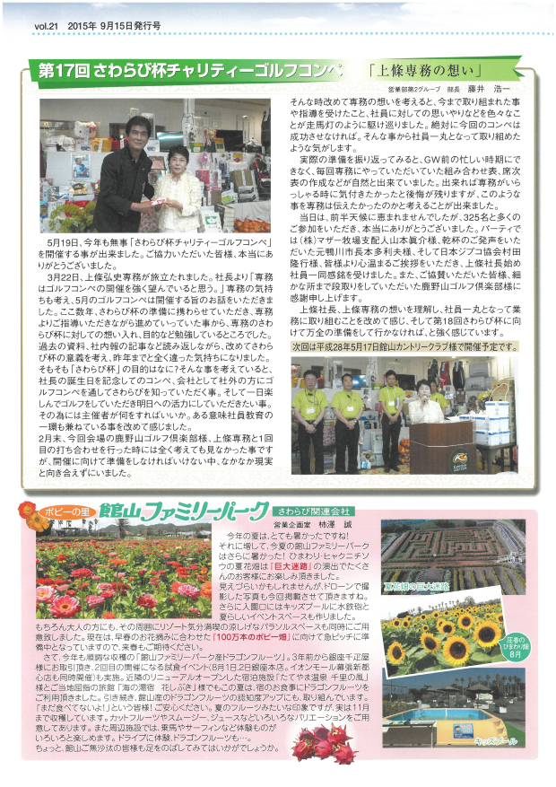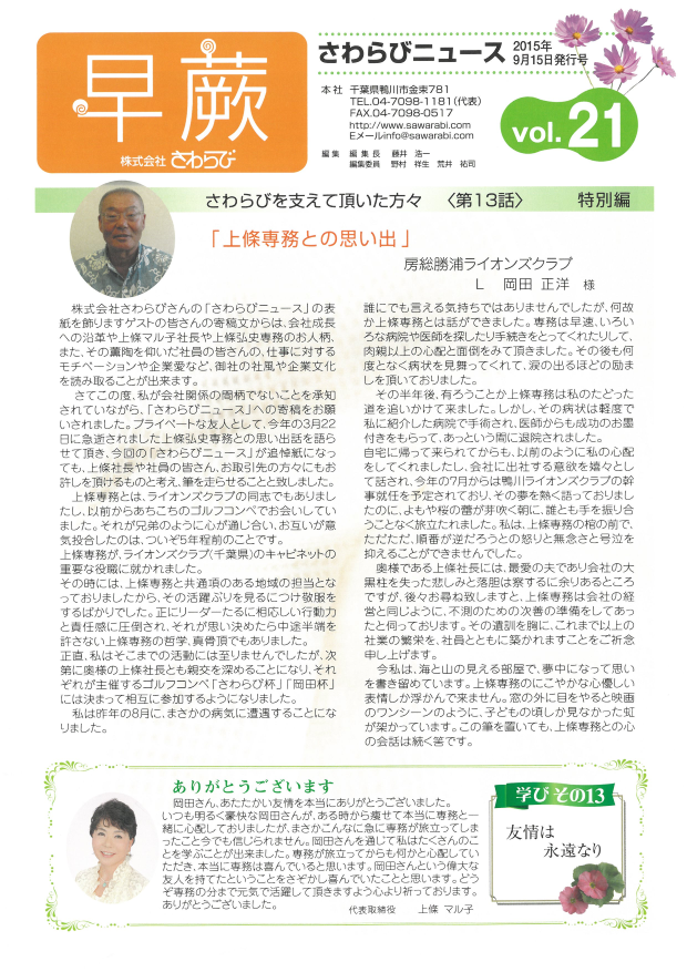 2015年9月15日発行号巻頭記事第13話 岡田 正洋 様「上條専務との思い出」 2024 9/13 さわらびニュース 2024-03-012024-09-13 さわらびニュース 2015年2月1日発行号巻頭記事第12話 小金 晴男 様「経営学に学ぶさわらび」 2016年4月1日発行号巻頭記事第14話 安田 耕太 様「地域の力を導き出す さわらびの皆様」 関連記事 2024年9月1日発行号巻頭記事第27話 武本 典久 様「繋がりと信念」 2024-09-12 2024年3月1日発行号巻頭記事第26話 渡辺 公康 様「信頼とは」 2024-09-12 2023年3月1日発行号巻頭記事第25話 星野 伸之 様「上條会長・上條社長の想い出」 2024-09-12 2022年4月1日発行号巻頭記事第24話 高橋 昭仁 様「感謝を心に、コロナ後を見据えて協力を!」 2024-09-12 2021年3月1日発行号巻頭記事第23話 廣瀬 勝彦 様「おもてなしの中にある厳しさ!」 2024-03-01 2020年6月20日発行号巻頭記事第22話 山口 愛美 様「仕事への想い」 2024-03-01 2019年12月12日発行号巻頭記事第21話 宮原 弘 様「縁を高める」 2024-03-01 2019年5月10日発行号巻頭記事第20話 原 藤一 様「新たな時代と変化への適応」 2024-03-01