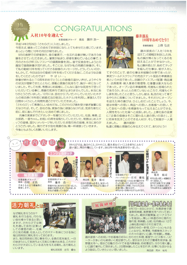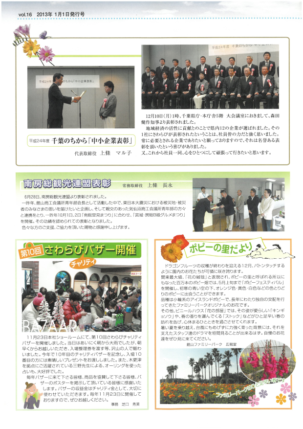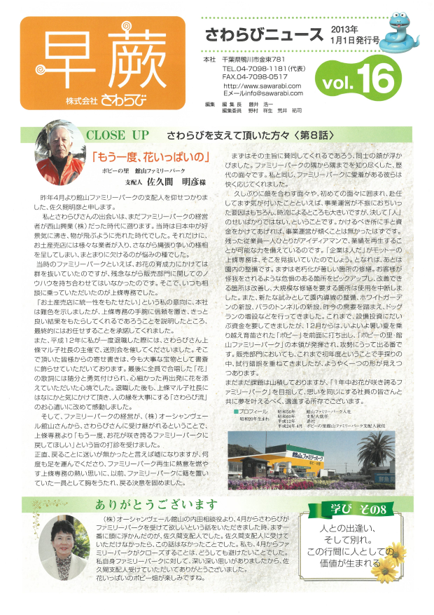 2013年1月1日発行号巻頭記事第8話 佐久間 明彦 様「もう一度、花いっぱいの」 2024 9/17 さわらびニュース 2024-03-012024-09-17 さわらびニュース 2012年7月10日発行号巻頭記事第7話 吉田 勝 様「出会いに感謝」 2013年8月1日発行号巻頭記事第9話 白幡 進 様「さわらびの力」 関連記事 2024年9月1日発行号巻頭記事第27話 武本 典久 様「繋がりと信念」 2024-09-12 2024年3月1日発行号巻頭記事第26話 渡辺 公康 様「信頼とは」 2024-09-12 2023年3月1日発行号巻頭記事第25話 星野 伸之 様「上條会長・上條社長の想い出」 2024-09-12 2022年4月1日発行号巻頭記事第24話 高橋 昭仁 様「感謝を心に、コロナ後を見据えて協力を!」 2024-09-12 2021年3月1日発行号巻頭記事第23話 廣瀬 勝彦 様「おもてなしの中にある厳しさ!」 2024-03-01 2020年6月20日発行号巻頭記事第22話 山口 愛美 様「仕事への想い」 2024-03-01 2019年12月12日発行号巻頭記事第21話 宮原 弘 様「縁を高める」 2024-03-01 2019年5月10日発行号巻頭記事第20話 原 藤一 様「新たな時代と変化への適応」 2024-03-01