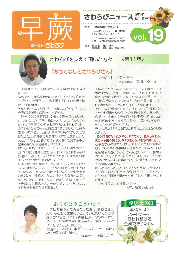 2014年8月1日発行号巻頭記事第11話 青柳 久 様「おもてなしとさわらびさん」 2024 9/17 さわらびニュース 2024-03-012024-09-17 さわらびニュース 2014年2月1日発行号巻頭記事第10話 中嶋 良一 様「さわらびの力」 2015年2月1日発行号巻頭記事第12話 小金 晴男 様「経営学に学ぶさわらび」 関連記事 2024年9月1日発行号巻頭記事第27話 武本 典久 様「繋がりと信念」 2024-09-12 2024年3月1日発行号巻頭記事第26話 渡辺 公康 様「信頼とは」 2024-09-12 2023年3月1日発行号巻頭記事第25話 星野 伸之 様「上條会長・上條社長の想い出」 2024-09-12 2022年4月1日発行号巻頭記事第24話 高橋 昭仁 様「感謝を心に、コロナ後を見据えて協力を!」 2024-09-12 2021年3月1日発行号巻頭記事第23話 廣瀬 勝彦 様「おもてなしの中にある厳しさ!」 2024-03-01 2020年6月20日発行号巻頭記事第22話 山口 愛美 様「仕事への想い」 2024-03-01 2019年12月12日発行号巻頭記事第21話 宮原 弘 様「縁を高める」 2024-03-01 2019年5月10日発行号巻頭記事第20話 原 藤一 様「新たな時代と変化への適応」 2024-03-01